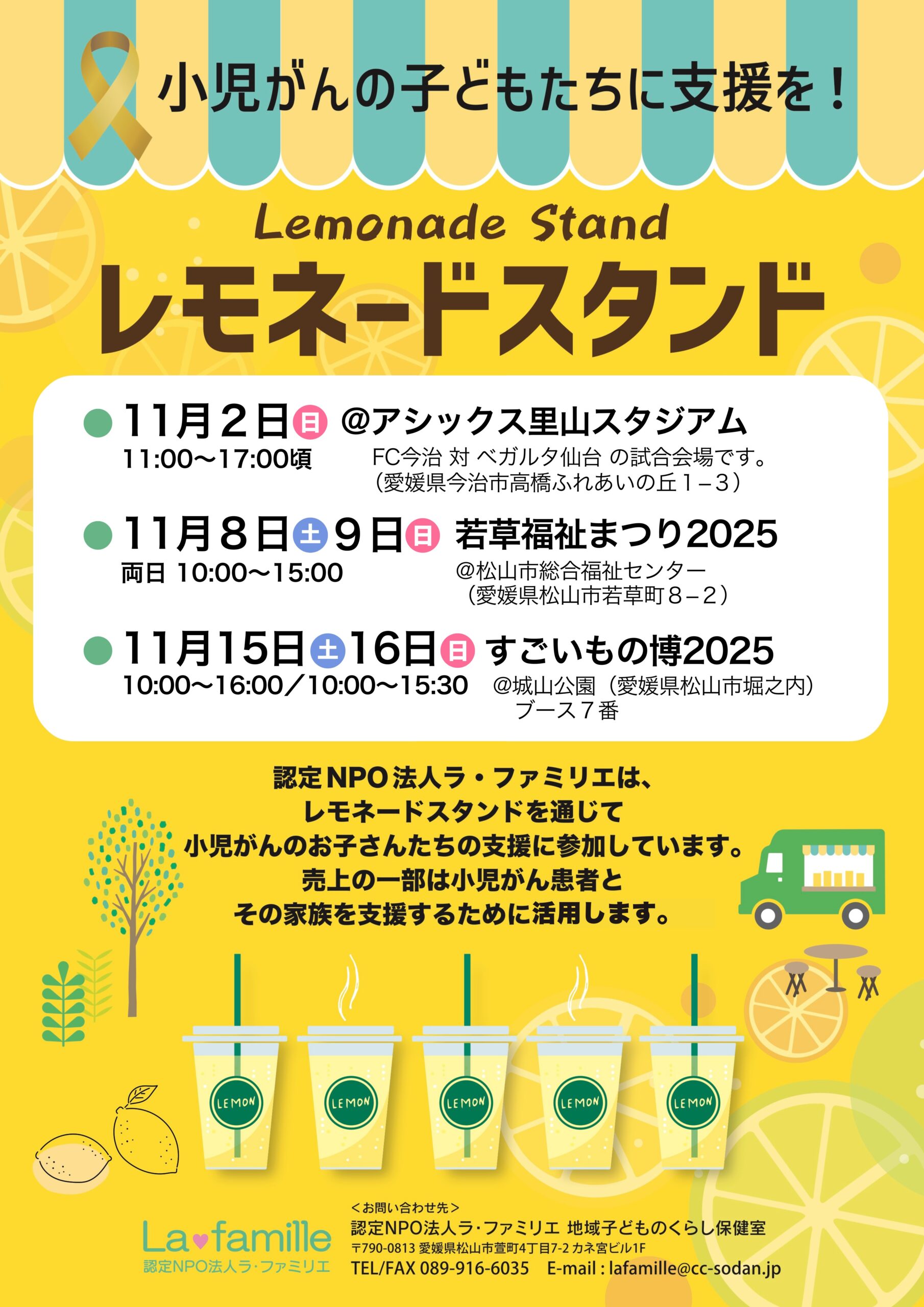 認定NPO法人ラ・ファミリエは、レモネードスタンドを通じて小児がんの子どもたちとそのご家族を応援しています。売上の一部は、小児がん患者・ご家族を支援する活動へ活用されます。